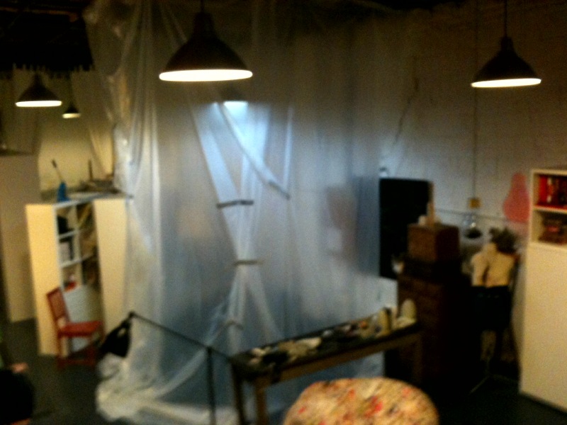 Well, I’m out-of-town, working on a movie for a week in Santa Fe and I have to admit that I’m really happy to be away from the apartment while they dig four feet into the cement floor to fix our main drain. I think this job came up for a reason! To keep me semi-sane. Here is what Jeff did to protect all of our stuff from flying cement dust. The area inside the tent is the only space the workers are allowed…:-)