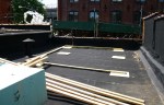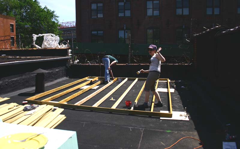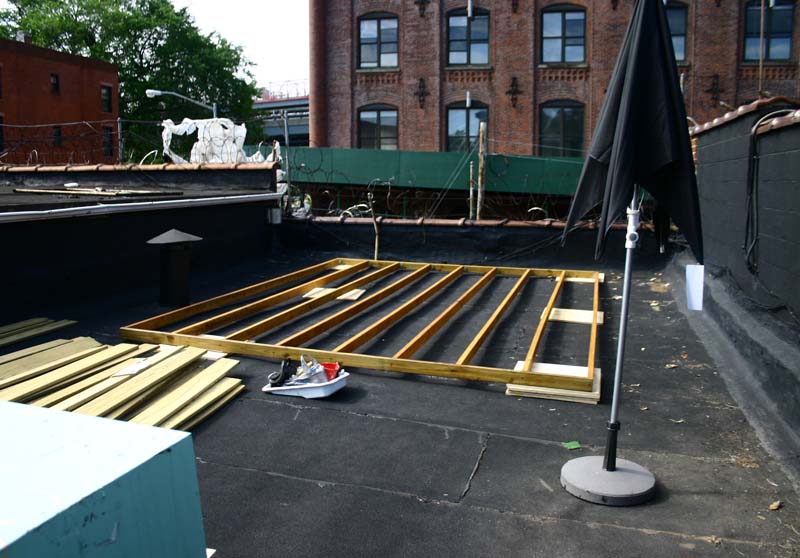 Well, we are almost done with our roof deck and worn out beyond belief! We planned on making this a two weekend project, but Lowe’s delivered the wrong sized lumber last weekend, so we were left with only two days. Luckily, on Saturday, some lovely friends helped us out and got the project way ahead of schedule before we were on own for Sunday.