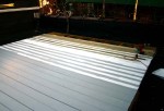 We ended up only doing one thing by the book, so in a few months we may be hating ourselves for some of our less than kosher choices. The deck frame is properly resting on 3/4″ plywood squares and seems to be pretty level, and the deck itself is soundly built, but we went against the advice of many people who said we shouldn’t paint the decking, and did it anyway. I can’t explain why I do some things when I’m not supposed to. I guess I just like to tempt the gods (and I just couldn’t believe that the crazy exterior primer and exterior porch paint wouldn’t last at least a few years before we move).