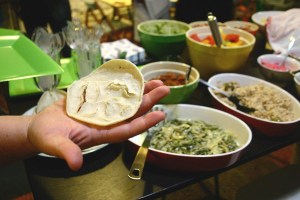 6:50pm: Put beef, chicken, and rajas in pans with lids and put tortillas in a steamer over a pot a water to reheat but keep the stove off!