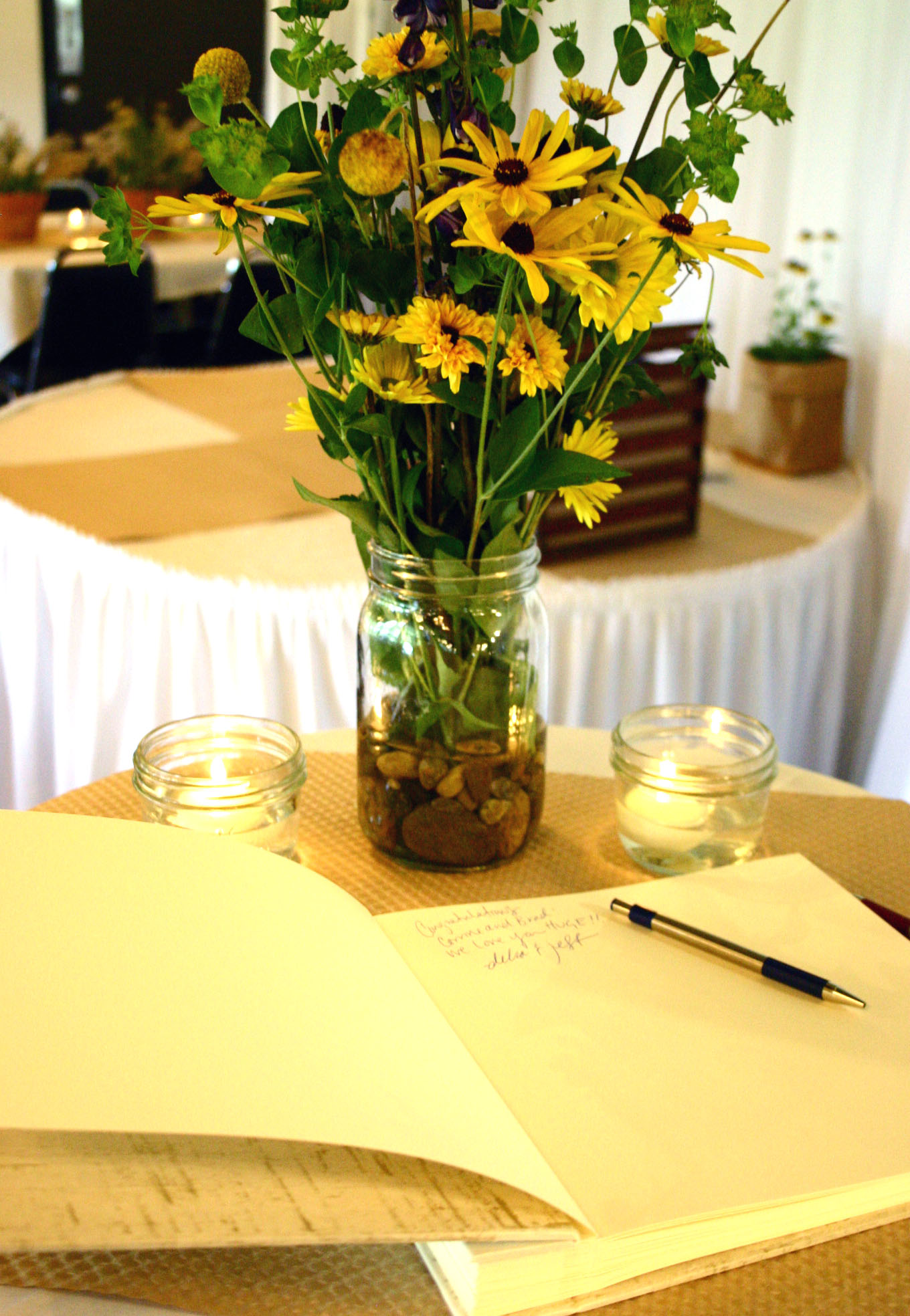 Tall mason jars held casual arrangements and short jars were scattered about with floating tea lights.