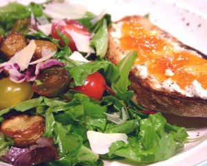 Preheat broiler. Toast bread in toaster or in broiler. Spread each slice with half of the goat cheese. Top each slice with 2 tsp of apricot jam. Put under broiler for about 1-2 minutes. Serve with salad!