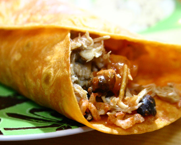 Heat two portions of beans and rice and chicken in bowls in the microwave. Divide between two tortillas. Add a little salsa, fold and eat!