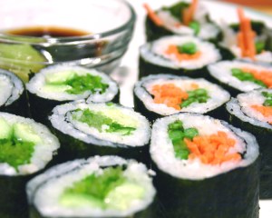 Form your sushi. Lay a sheet of nori on a bamboo rolling mat. Spread 1/4 of the rice on the sheet, leaving the top and bottom edge of the nori clear. Lay 1/4 of your veggies down the center of the rice and using the mat and gentle pressure, roll into a tight roll. Lay seam side down on a plate and repeat 3 more times. By the time you finish all four rolls, the seams will have completely fused on the seaweed and you can slice the rolls. Use a sharp knife and clean your knife between cuts so it doesn’t start to stick. Serve with wasabi and soy sauce!