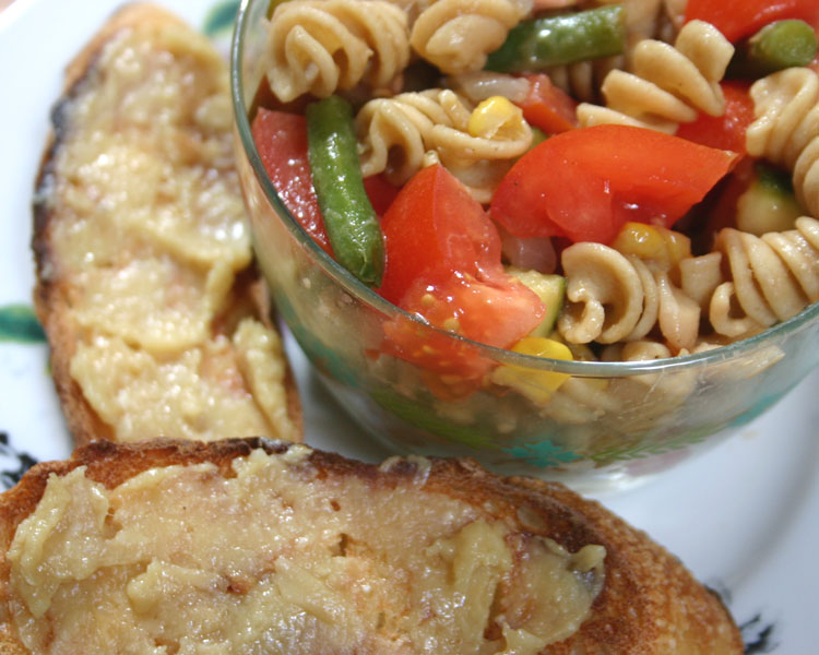 Toast your bread, once or twice to get a nice crunchy browned toast.  Spread on the garlic mixture while the toast is still hot.  Serve with the chilled salad or warmed in the microwave for a minute.