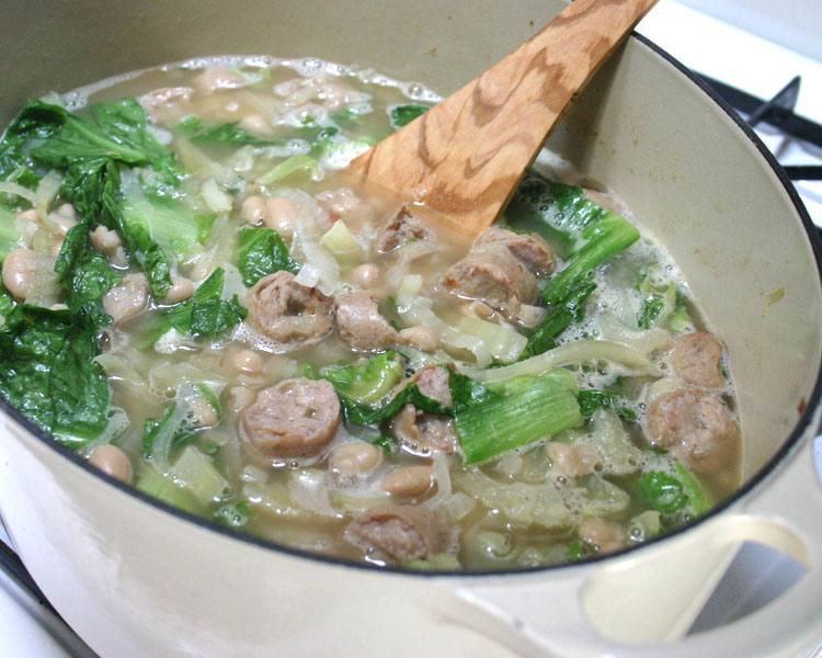 • 6 sweet Italian chicken or turkey sausages, casings removed if they have them and cut into chunks