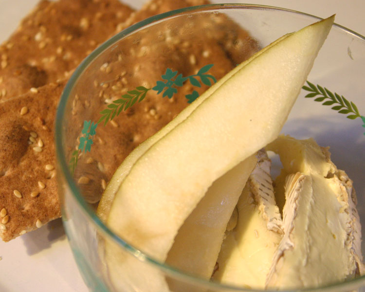 Eat some!  We like to slice the pear and brie thinly and make little open-faced sandwiches with everything.  Use about half a pear each day and rub the exposed half with lemon juice so it doesn’t brown by the next day.  Store the unused half in the fridge.