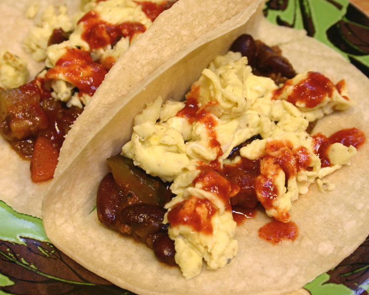 Heat spray in a non-stick skillet over medium heat.  Whisk eggs with a splash of milk, salt and pepper in a bowl.  Pour into the hot pan.  Let set for about 30 seconds and then stir with a spatula rubber spoonula until scrambled to your liking.  Remove eggs from pan and set aside.   Heat your tortillas in the pan until they warm up and soften a bit.   Divide eggs and chili between the tortillas and top with hot sauce.