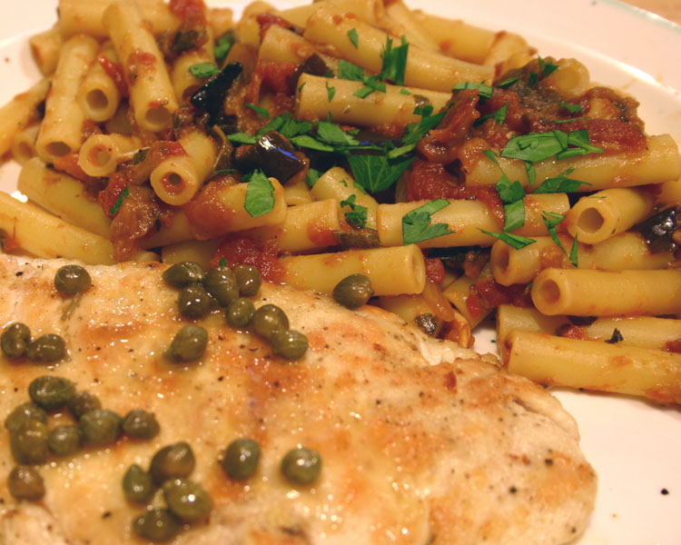 Put chicken breast halves between plastic wrap and pound with a mallet until about 1/4 inch thick.   Sprinkle with salt and pepper and coat lightly with flour.   Fill a pot with water and salt well.  Bring to a boil and add pasta.  While you do that, heat olive oil in a skillet over medium high heat.  Add the cutlets and saute 2 minutes.  Turn over and saute 1 minute.  Remove cutlets from pan, add wine to the pan and bring to a boil, scraping all the brown bits off the bottom.  Stir in chicken broth; bring to a boil.  Cook until broth mixture is reduced to about 1 tablespoon.  Stir in lemon juice and capers.  Pour sauce over chicken.  When your pasta is done, drain well.  Serve one chicken cutlet with half of the pasta and half of the sauce.  Sprinkle with parsley.