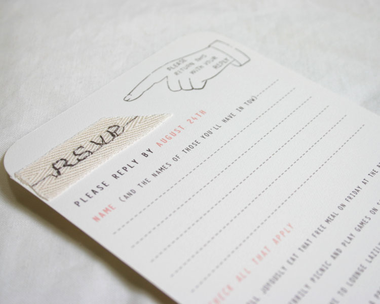 Print a pattern on the back of your RSVP cards so you can tuck it into the invitation pattern-side-up. It adds color, texture and happiness! We also printed the return labels with each guest's address as a personal touch. This way, they won't have to do anything except fill out their card and pop it in the mail.