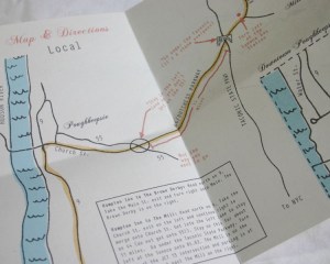 If you have a lot of travelers coming to your wedding, be generous with any information they might need to get there. We found a card at Papersource that we recreated with stencils for our info booklet cover.