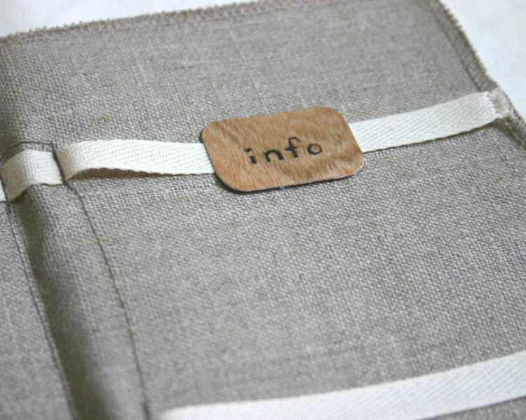 We created a simple linen booklet to tuck everything into. We couldn't afford enough real wood paper to back our invites in, so we used a small amount for our "info" label.