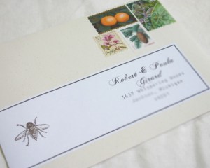 If you can't afford a calligrapher, spruce up a printed sticky label with elegant fonts and a simple rubber stamp. We bought several nature inspired postage stamps that looked lovely together to add up to our total rate.