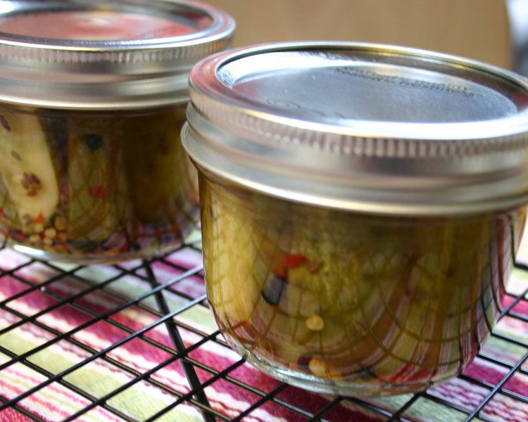 Repeat the process with the other 4 jars. Allow to cool completely and then check to make sure the tops are sealed by tapping the lids. As they cool, you might even hear the “pop” sound as they seal. Store in a cool, dry place for up to a year. We are going to try a jar a week to see when the flavor is best!