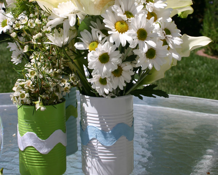 Can vases! Spray painted and wrapped in ric-a-rac.