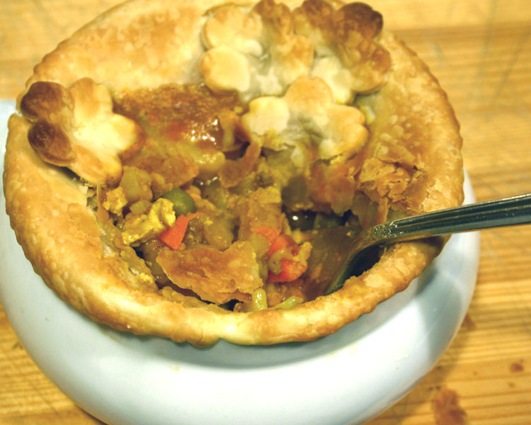 Preheat oven to 400. Fill two ramekins, small casserole dishes, or french onion soup bowls with some of the curried veggies. Top with the crust and pinch around the edge of the dish. Cut slits in the crust for venting. Bake for about 30 minutes or until bubbling and crust is golden. Cover the crust with foil if it starts to get too brown before its bubbling. Remove from oven and cool for about 10 minutes before serving.