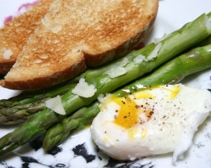 Fill a small pan with water and bring to a boil over high heat. Add the asparagus and boil for about 3 minutes or until tender. Remove from water and rinse with cold water. Divide between two plates and sprinkle with cheese, salt and pepper. Add a splash of vinegar to the water and lower the heat just so it’s lightly bubbling. Crack both eggs gently into the water and simmer for about 2 minutes or until set. In the meantime, toast your bread. Remove the eggs with a slotted spoon, transfer to the plates and sprinkle with salt and pepper. Serve with the toast!