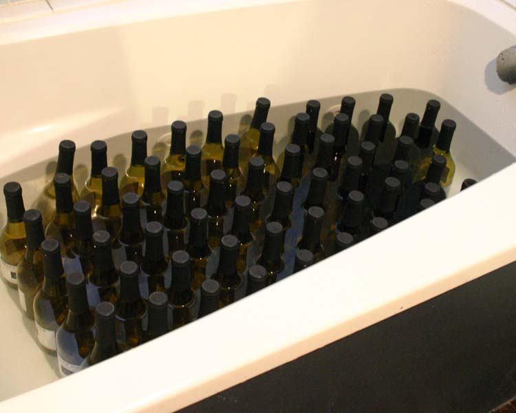 Design and print your new labels on 8 1/2 x 11 sticky paper, cut them out and stick them onto the dry bottles. Additionally, we went over the Chardonnay labels with a clear contact paper so the printing won’t run when the bottles are on ice. This is a great “do far ahead” project for a wedding, party or even an event where you want to advertise on the labels and resell glasses for a lot more than it’s worth! 😉