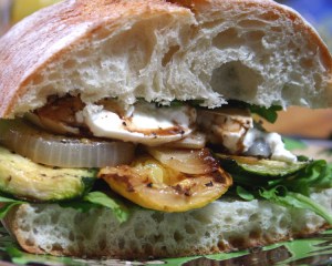 Spread one side of each roll with half of the burrata. Drizzle with balsamic vinegar, a little olive oil and sprinkle with salt and pepper. Top each sandwich with half of the veggies. Top the veggies with 1/2 of the arugula. Finish off with the top half of the bread and eat!