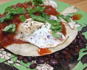 Divide reheated beans between two plates. Heat a skillet over medium heat for about a minute. Spray with cooking spray and add the tortillas. Toast on both sides for about 30 seconds or until lightly golden and warm. Remove from pan and set each atop the beans. Spray pan again and crack both eggs in. Sprinkle with salt and pepper. Cook on one side for about 45 seconds, flip and cook as long as you like them…about 45 more seconds for over medium. Transfer eggs to each tortilla. Divide the sauce over the two eggs. Sprinkle with a little hot sauce and the cilantro.