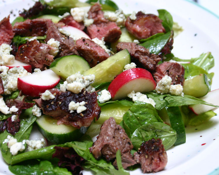 Heat a drizzle of oil in a skillet over medium high heat. Add the steak when the oil is hot and sear about 2-3 minutes per side. Remove from the pan and let rest about 4 minutes before slicing thinly. Divide the lettuce, radishes, cucumber, steak slices and blue cheese between two plates or bowls. Whisk together a drizzle of olive oil and balsamic dressing with salt and pepper in a small bowl. Drizzle lightly over the salad (a little goes a long way with this one!).