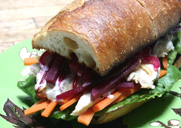 Pull your bread out of the freezer.  Heat your broiler for about 5 minutes.  Place both rolls, opened up under the broiler and toast just until defosted and lightly golden.   Starting from the bottom, stack your sandwich fillings as follows; bread, romaine, carrots, chicken, a generous drizzle of horseradish mayo, beets and then bread.   Eat!