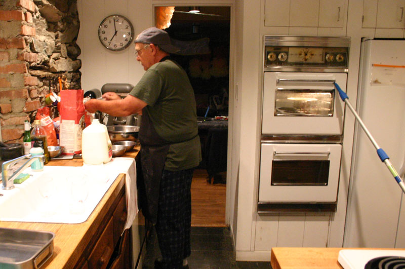 My dad baking the cakes. He had to use a roller extender to keep the oven door shut to maintain a consistent temperature!