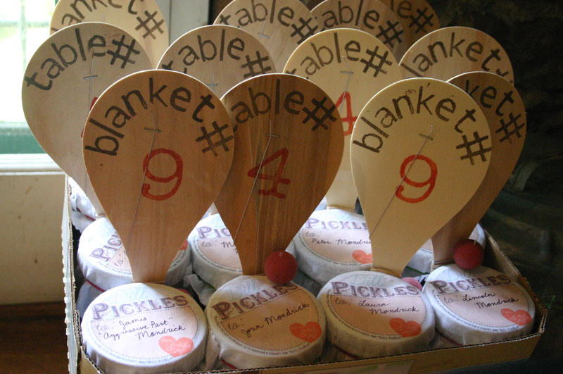 We attached table number paddles to the pickle favors and pre-alphabetized them in boxes.