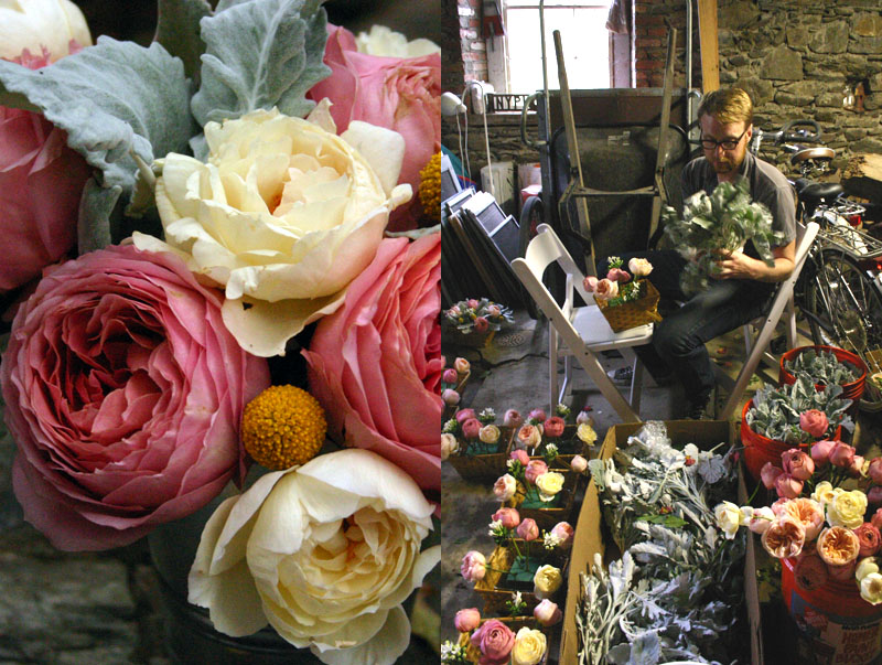 Left: We chose garden roses as a cheaper alternative to peonies and used dusty miller as our greenery. Right: The groom works on the picnic basket centerpieces.