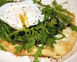 Turn the heat up on the water if it’s not bubbling by now. Gently slide the eggs into the water from the cups. Simmer 3 minutes. While the eggs simmer, cut the pizza in half and top each piece with half of the arugula. Remove the eggs from the water with a slotted spoon and place on top of the arugula. Sprinkle with pepper. Eat!