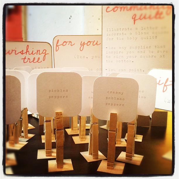 I’m planning two baby showers right now, so I was thrilled when I came up with an idea that utilized something I already had in my house. You could use this idea for place settings at a wedding or for the food and activity signage at any shower or party. I simply cut 1.5 inch squares of Kraft chipboard with my paper-cutter and glued ONE end of the clothespins in the center of the squares. You have to leave one end free so you can still open the pin to hold the card. I printed the food labels, gift table sign and activity instructions on regular old card stock from an office supply store and then used my edge cutter to round them out. The whole process took about 1 hour!