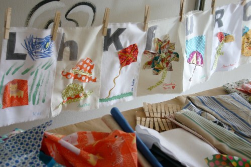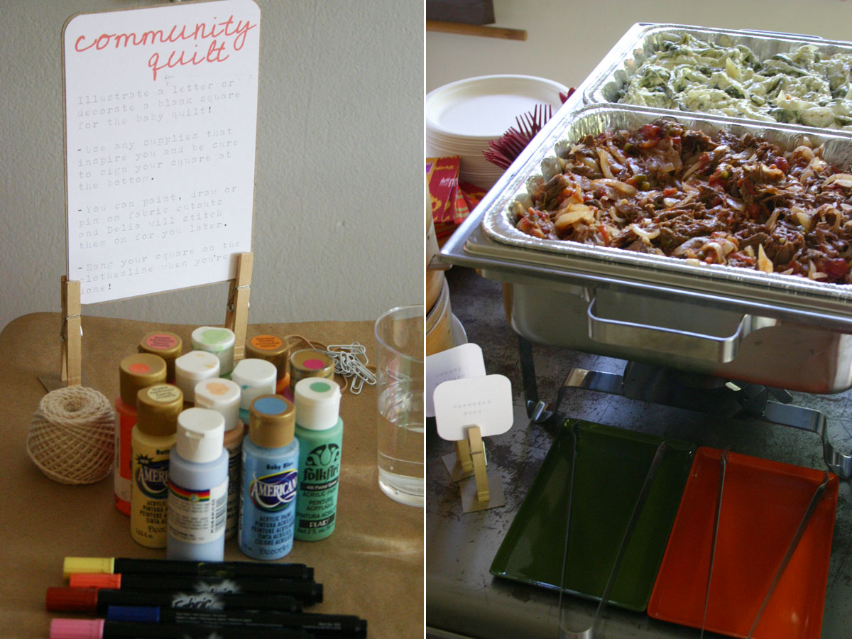 - Activities/Group Gift- Alphabet Baby Quilt Station: We provided calico prints, paints and fabric markers for each person to create a letter for the baby quilt. They pinned everything on and I took it home to applique and sew it all together! Wishing Tree: Each guest wrote a wish for the baby or couple on a little tag and hung it on a money tree for the nursery.