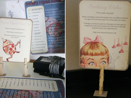 - Games- Nursery Rhyme Match Up: match the title to one verse (we made this very hard, using verses rarely heard from older rhymes) and Birthday Card Station: We provided a birthday card for every year of the baby’s life from 1 to 21 and had each person fill one out with advice, stories or wishes for that year of life.