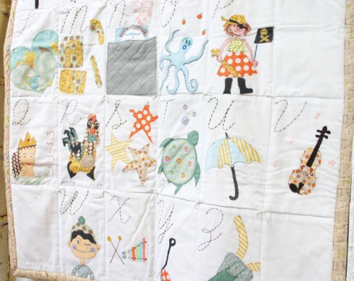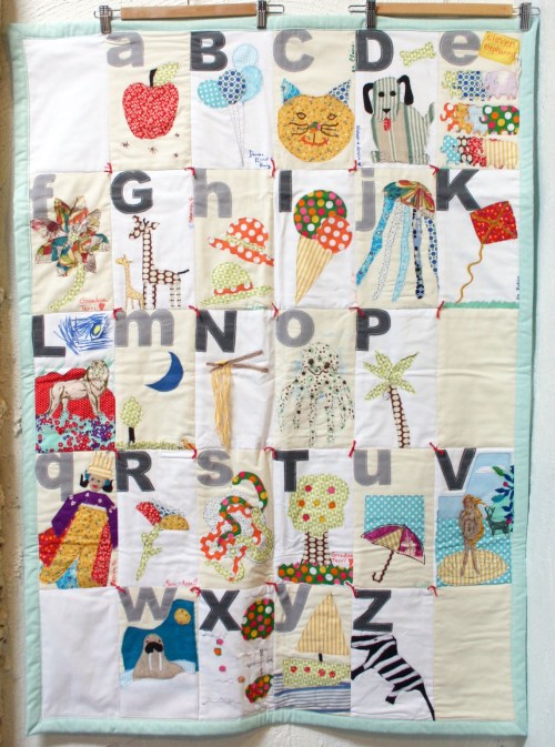 Here’s a quick post to show you how the community baby quilts turned out from the April baby showers. Giving 30 people a block regardless of artistic ability could spiral into something pretty ugly, but if you carefully control what people are allowed to use to make their block, it will turn out adorable no matter what. (And as the putter-together of it all, you could also tweak things a bit to make it look a little better too! ;-))