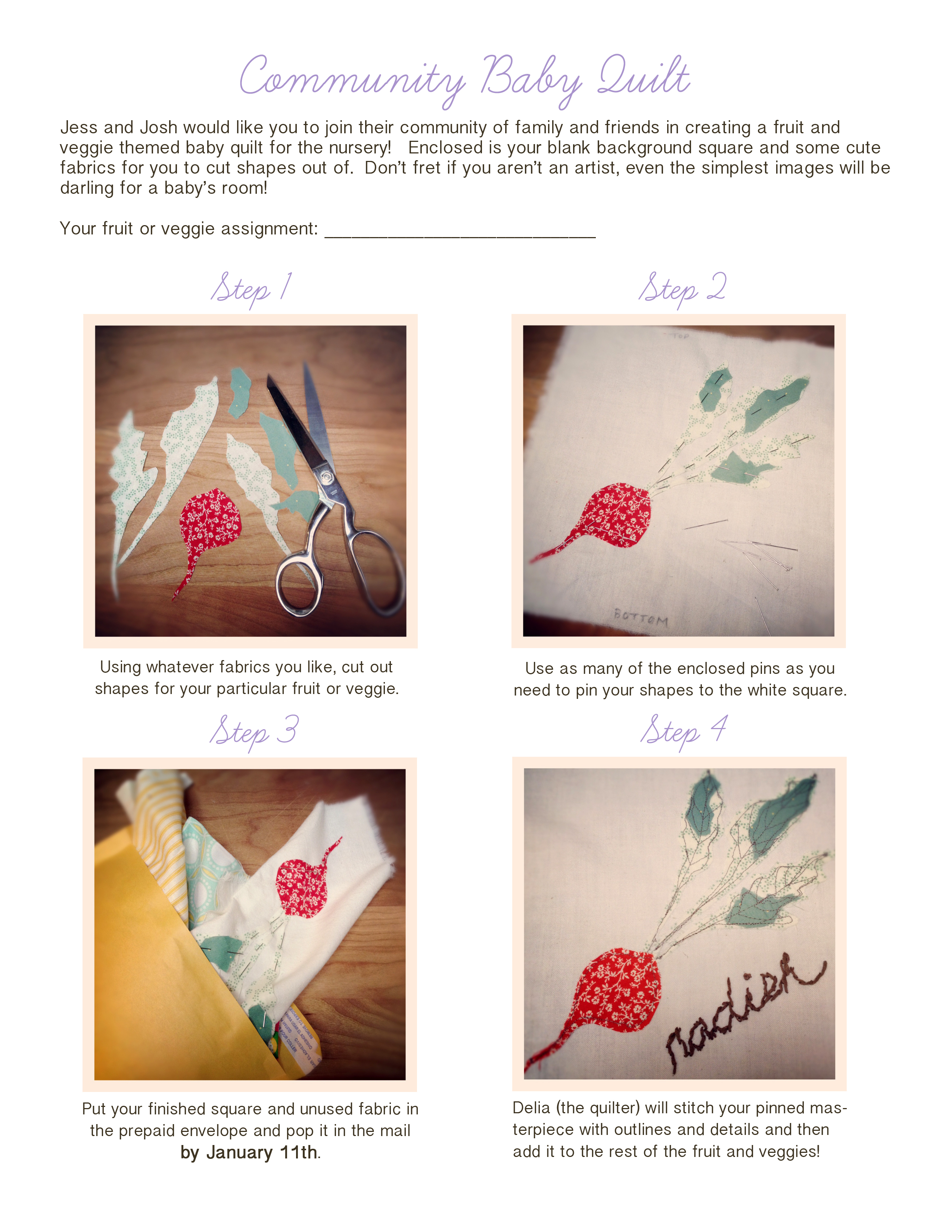 Last year, I threw two baby showers where the guests collectively made adorable baby quilts to give to the couple as a gift. After I posted about them, I was contacted by an expecting mom to help her put together a similar quilt for her baby. She picked the participants and assigned a fruit or vegetable to each person. I mailed each person cute fabric pieces, a white background square, straight pins and instructions with return postage.