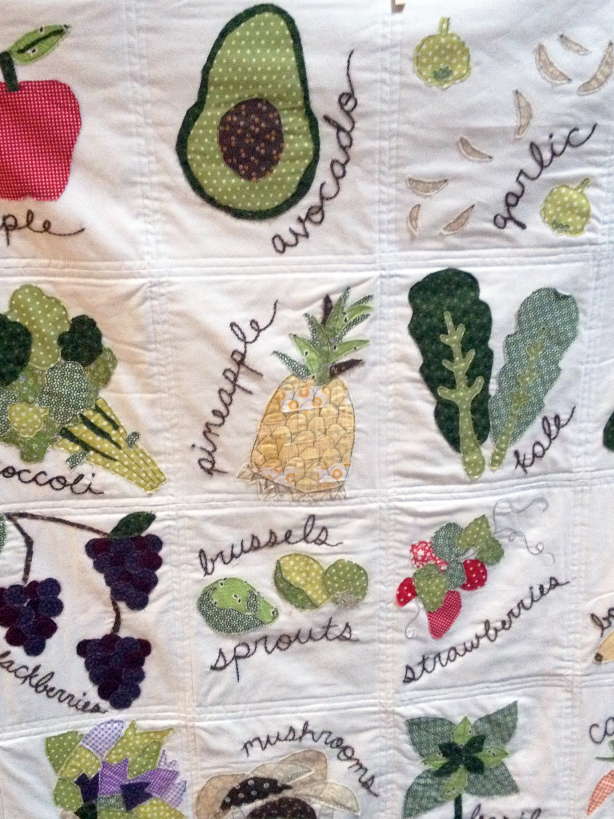 They mailed their block back to me, pinned together and all I had to do was stitch them down and embroider the name of the fruit or veggie! I love this quilt even more than the ones from last year because we didn’t allow fabric pens or paint which made the final product cleaner and more professional looking. SO cute!