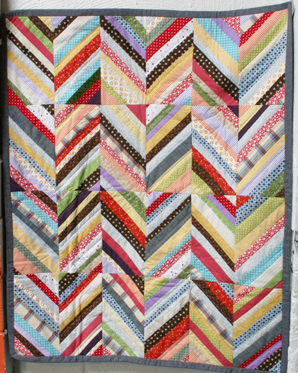 I backed the quilt with a navy and red woven ikat dot print and bound it with navy cotton chambray. The backing and the binding are really what help to make it look modern and cool. Here’s how I pieced the strips!
