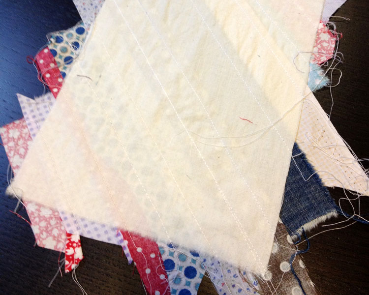 Mark 12 unbleached cotton rectangles or squares with a line from the top right corner to halfway down the left side. Do the same for the other 12 rectangles, but reversing the direction. The line acts as a guide for stitching your first strip down.