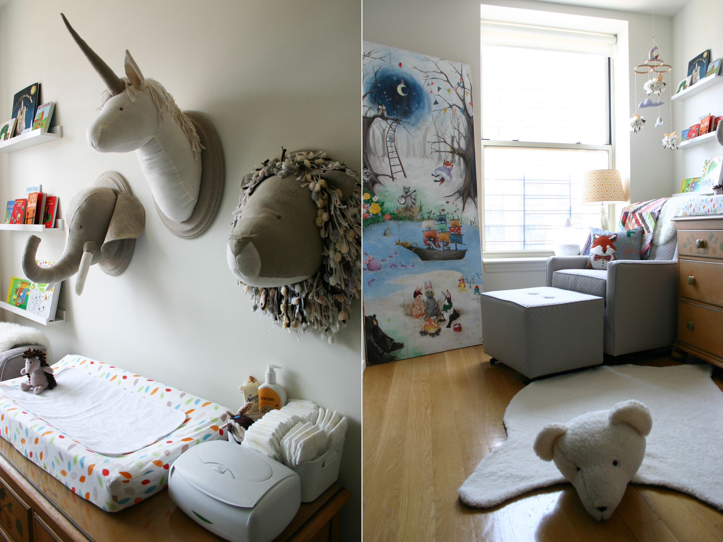 IMG_8003We finally finished our magical woodland nursery and I am absolutely in love!   Rather than forcing the typical gender stereotypes (I mean…I don’t even know this person yet!),  I wanted to create a mostly unisex nursery that encourages a healthy imagination since that’s what I remember most from my own childhood.   We would gather around as my mom told elaborate stories about gnomes and fairies that my brothers and I fully believed and lived.  They were so magical and real to us that I wanted to start my own child’s life out with that same sense of possibility and wonder.    I combined stuffed animal taxidermy with a large painted mural of a magic forest, neutral furniture and the most modern-looking nursery essentials as possible.  I already posted about some of the elements in the room, but the final result below really brings everything together beautifully.  I hope you feel inspired to keep things simple, magical and woodsy for your baby too!nursery 1IMG_7997IMG_8036nursery 3IMG_7976IMG_8035nursery 2IMG_8010Sources: