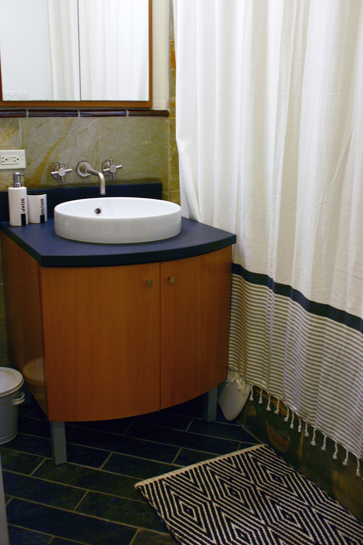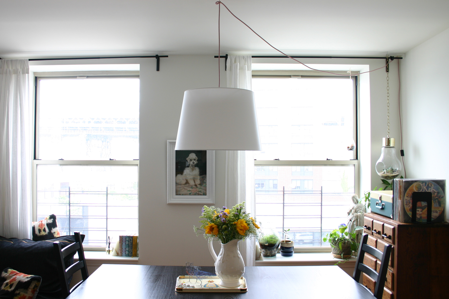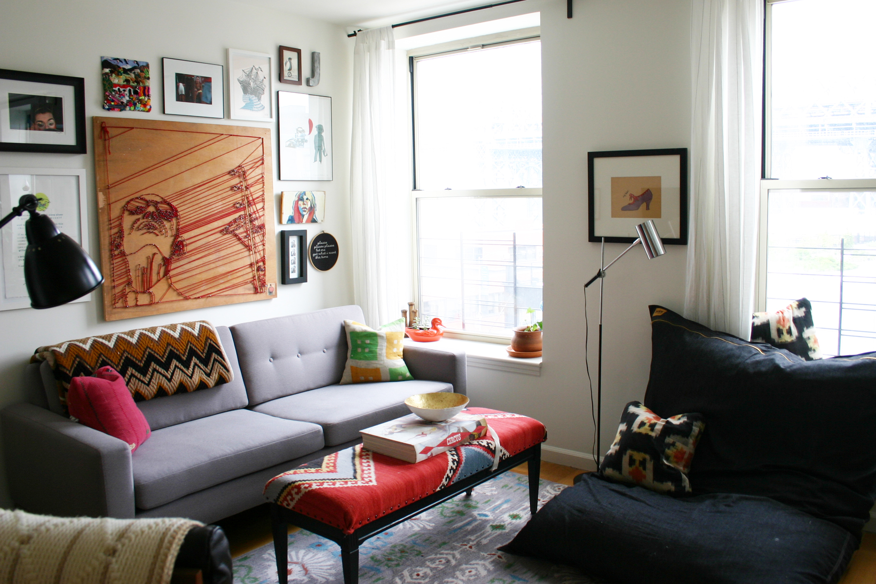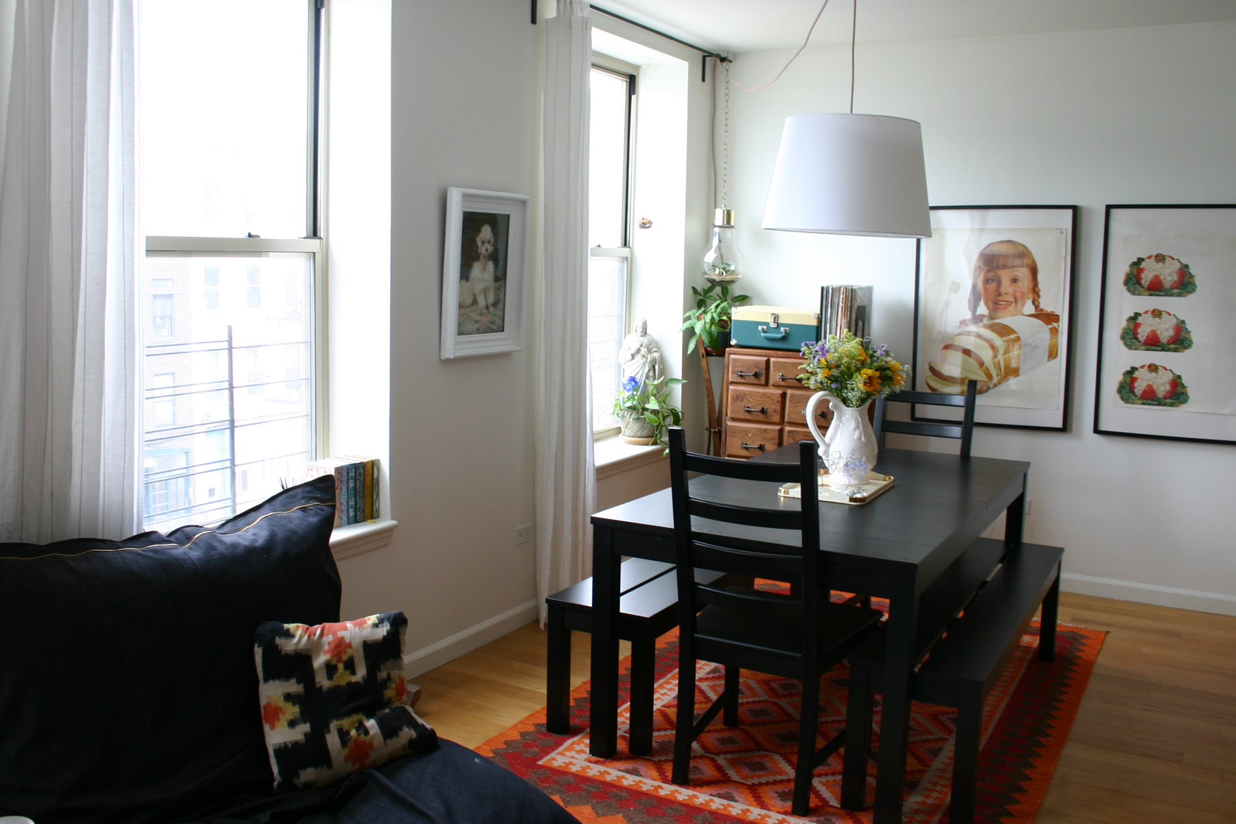 We love our new apartment, and are thrilled to have a low maintenance space with central air for our new adventure into parenthood, but fitting 1,400 square feet of stuff into a small two bedroom condo with one good closet was really difficult. I had to give up my gigantic studio for a crammed desk and we got rid of three rooms worth of furniture in exchange for more practical pieces. With my nesting instinct in full swing, I took the move as an opportunity to freshen our decor. I had my loveseat and sofa recovered, bought some new rugs, new towels and linens and updated a few pieces of furniture. It’s amazing how a new space can change how you look at your own stuff! My advice for anyone out there moving soon is to look at each thing in a new way as you pull it out of the box and ask yourself if you could put it in a new spot, paint it or change it in some way to give it a new life. It’s the cheapest way to give your home a face lift. Here are the photos of our new place!