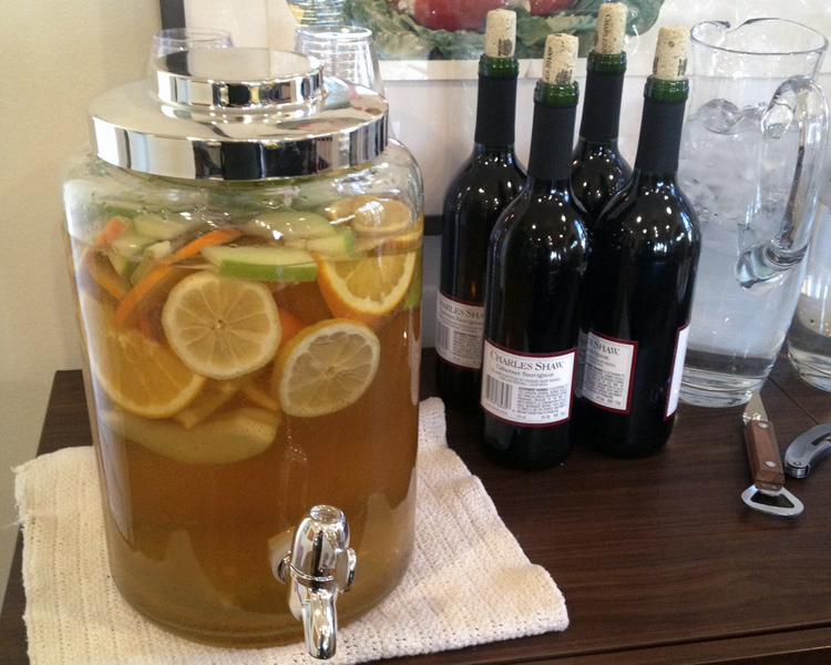 #3 : Ask guests to bring a bottle of wine to save some money.  Offer one cocktail in a large dispenser and one other non-alcoholic drink and let your guests do the rest! We made a winter white sangria and hot chocolate.