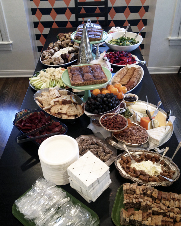#2 : Having food at various levels helps to fit more on one table. Elevate some of your dishes on cake plates or stands so you can tuck other dishes under and around them. We had two wintry stews in the kitchen as well for people who wanted more of a meal.