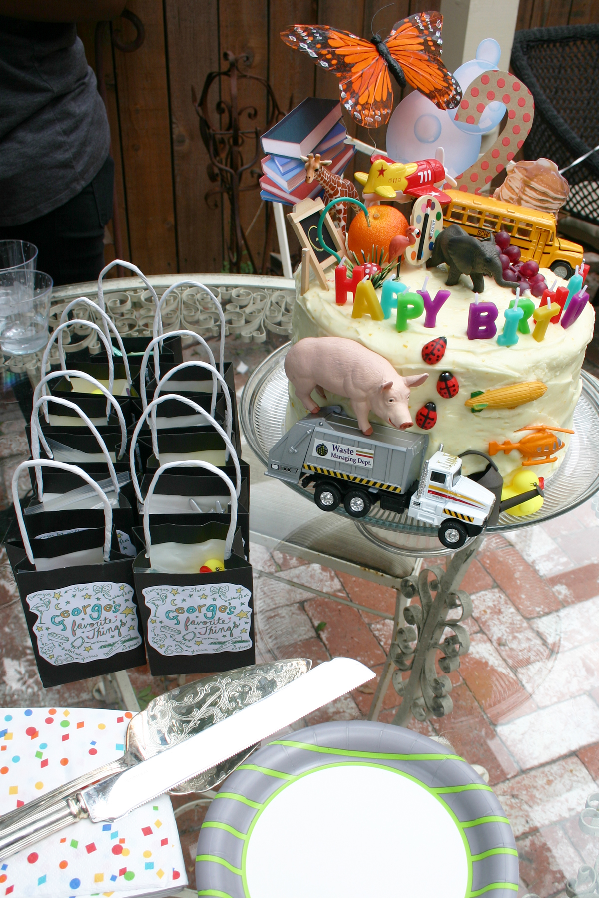 The cake was covered in favorites too, like a garden hose, pig, chalkboard and a garbage truck. I found that stuff on Amazon, at Michael’s in the doll house section and in a few other craft stores. The icing was a lemon buttercream and the layers were a nice surprising rainbow-colored yellow cake!