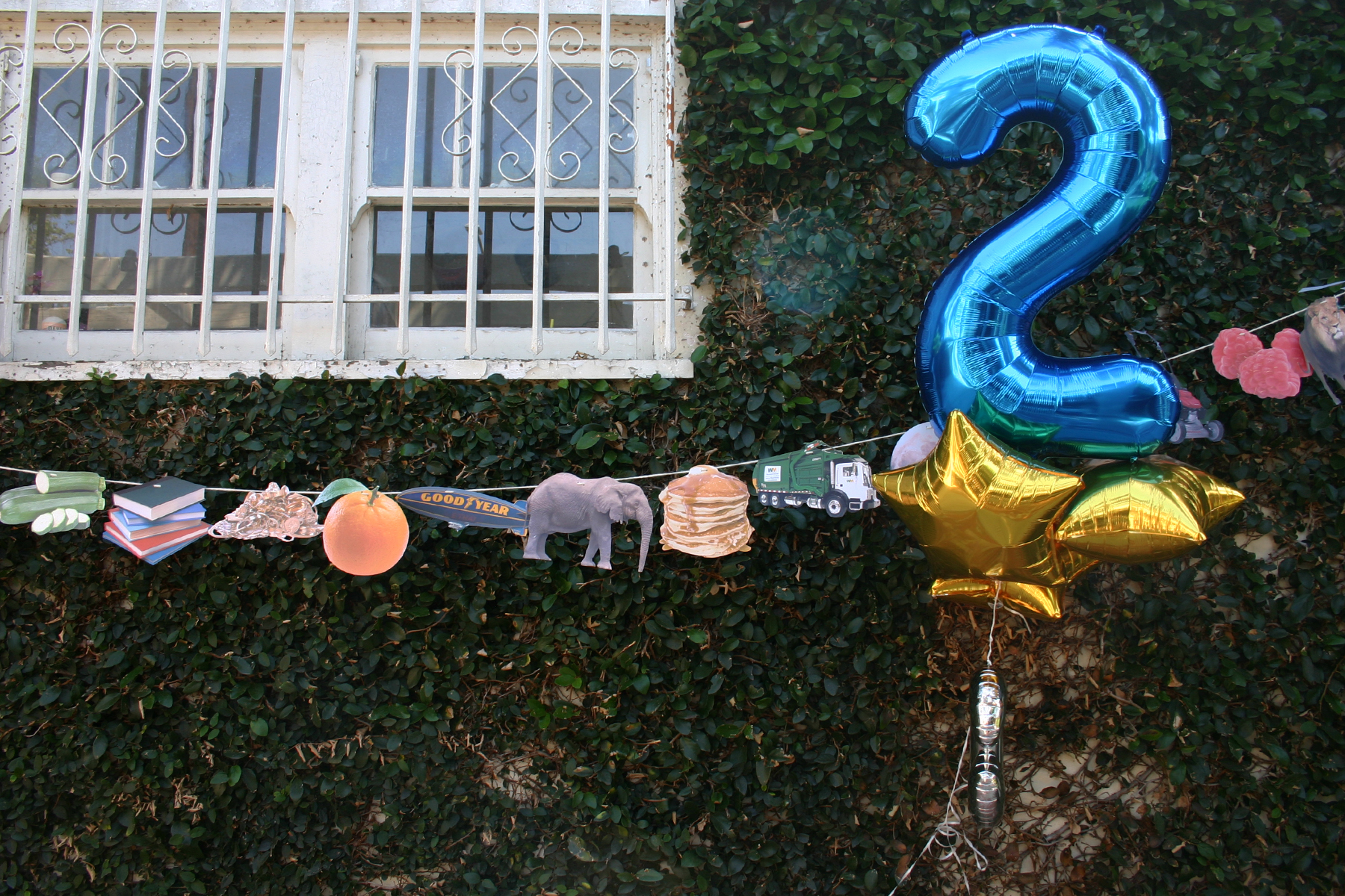 For George’s second birthday a few months ago, we thought it would be cute to do a “favorite things” themed party. After an exhausting year, we decided to use the same simple party formula as the year before but instead of making the food, we ordered from a yummy BBQ joint and rented a bounce house for the older kids (and me). I was shocked to find out that bounce houses are VERY affordable! Only about $80 for the whole day! Totally worth it.