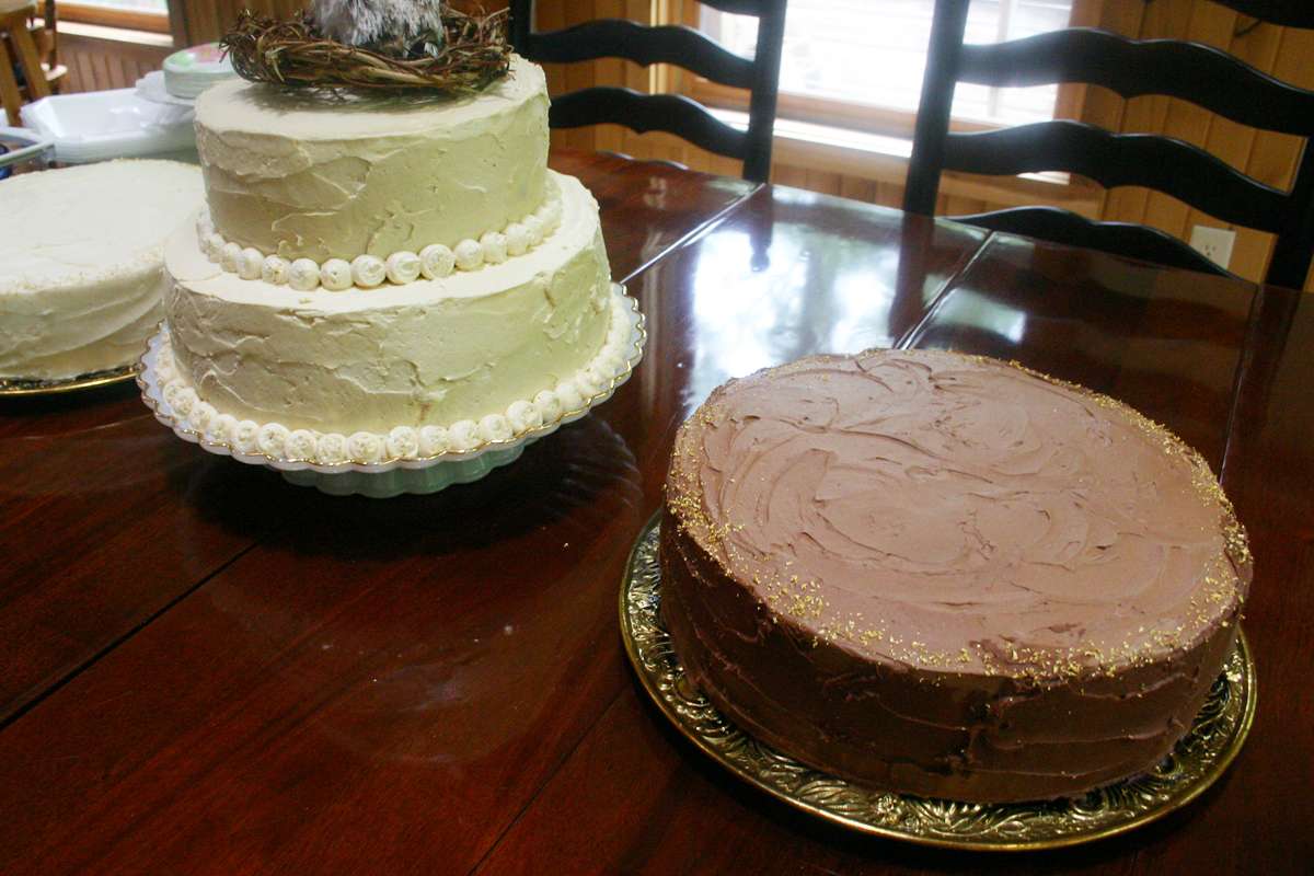 We used the Magnolia Bakery recipes for the carrot cake, yellow cake, cream cheese frosting and chocolate frosting. I suggest testing any recipe you are doubling or tripling in your size pan well before the big week, and baking each in the oven separately if possible so they don’t burn. It will take longer than the recipe says if you are using a full batter recipe in a 14″ pan, for instance, than it would in two or three 9″ pans. Also, be sure to use an oven thermometer! I’ve never met a standard oven that was truly the temperature you set it at.