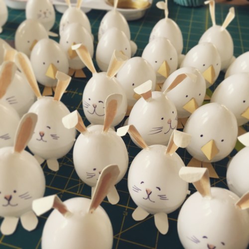 I glued paper ears and beaks to simple white plastic eggs for our egg hunt…tedious but adorable!