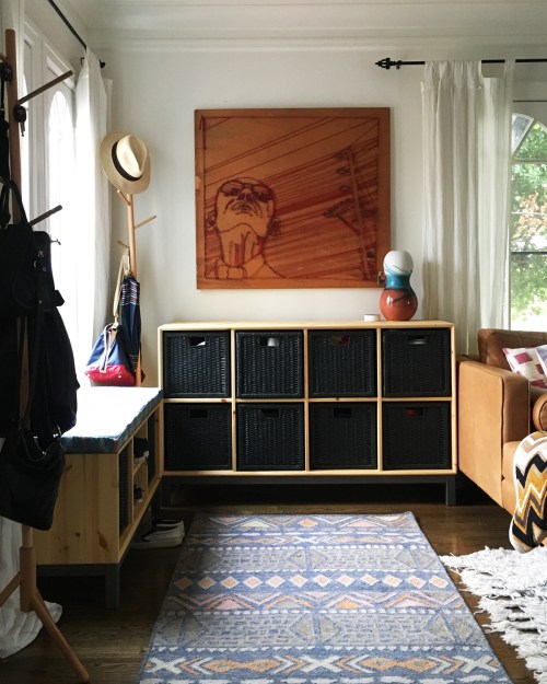 When we moved into our house three years ago, our landlord at the time asked us to keep his giant Mexican cabinet in the house that we absolutely didn’t need. I loved it, don’t get me wrong, but it was useless as a storage piece and didn’t fit visually in the house. It was just way too clunky for the space. When we bought the house last summer, I finally had my chance to move it outside and rethink our entryway! Our house has NO storage…I repeat…NO STORAGE. We have one and half closets total so figuring out a way to store toys, shoes and bags was quite the challenge. Here’s what we did.
