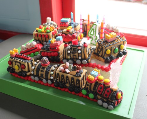 I covered a vanilla sheet cake with train cars and decorated them with TONS of candy from Dylan’s candy bar.